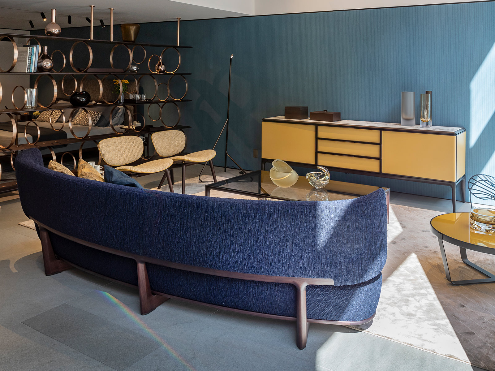 The collection on display includes some of the latest pieces mixed with those that have already been successfully brought to Shanghai, designed by Roberto Lazzeroni. They include the Icosofà sofa and the IcoLounge armchair, with their distinctive bent frame and winding design, in solid wood. The elegant Dorotea dressing table, which, with its hidden flap and the pockets in contrasting wood, is a small masterpiece of cabinet-making, completed by the Jun stool. The big, comfortable Tomorrow Morning bed, with a double-height adjustable headboard, offers optimum comfort even when you are sitting on it. Lastly, the Petit Matin tables/nightstands,with two glass, coloured glass or marble tops staggered over each other, creating ever-different combinations of colours and materials. The very latest pieces include the Odile coffee tables and the Odette console, the Oblique cabinets designed by Studio Draw, and the Ala chair designed by Giuseppe Casarosa.