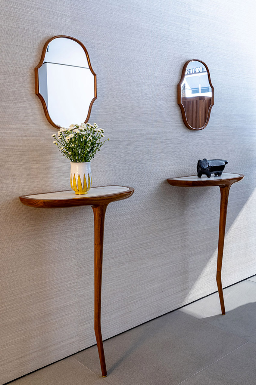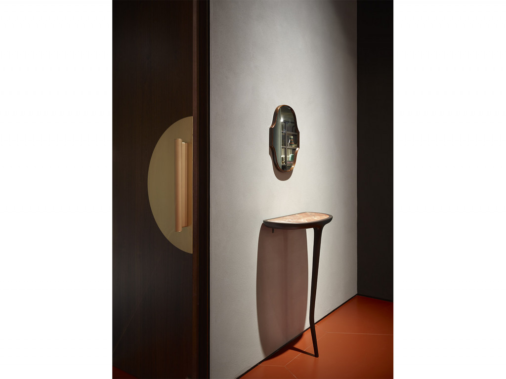 Elegy, designed by Roberto Lazzeroni in 2017, is a sophisticated console that confirms the company's vocation for luxury craftsmanship. A desire to experiment that translates into mastering processing techniques and attention to detail.To be fixed to the wall, it is made of solid American walnut. The semi-elliptical top can be made from wood or marble. Customizable with multiple finishes, the...