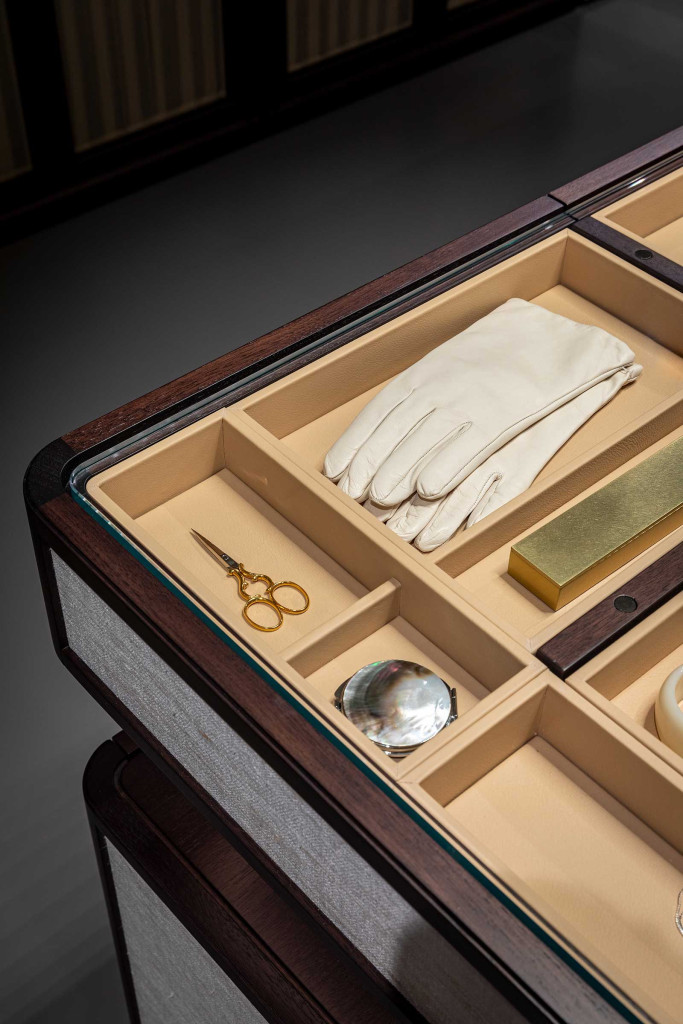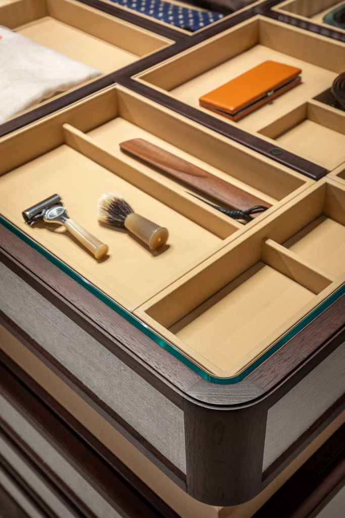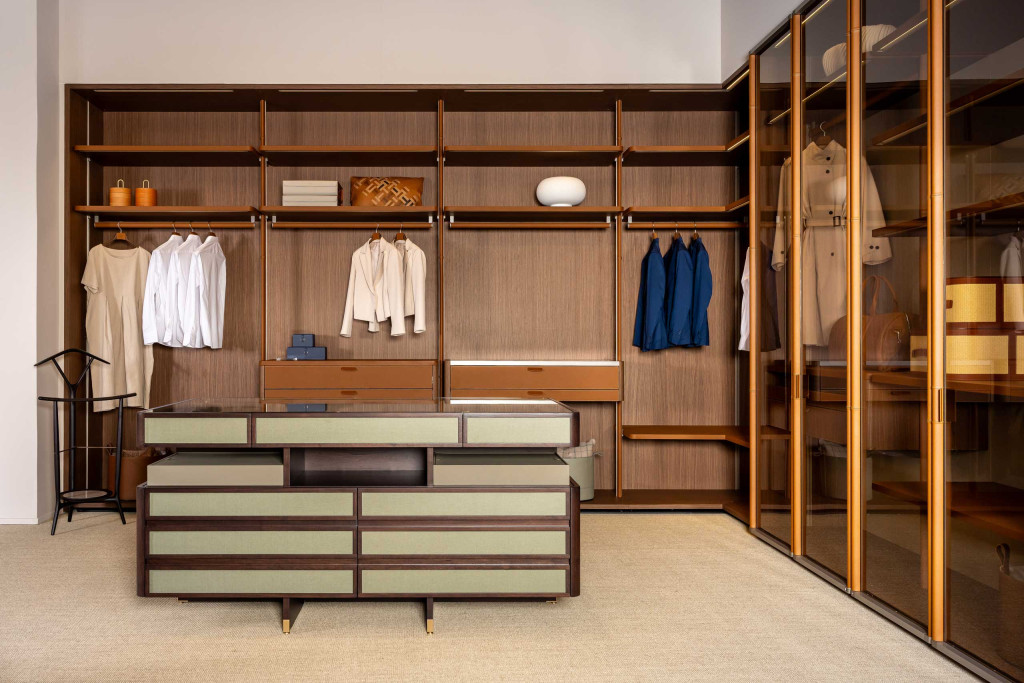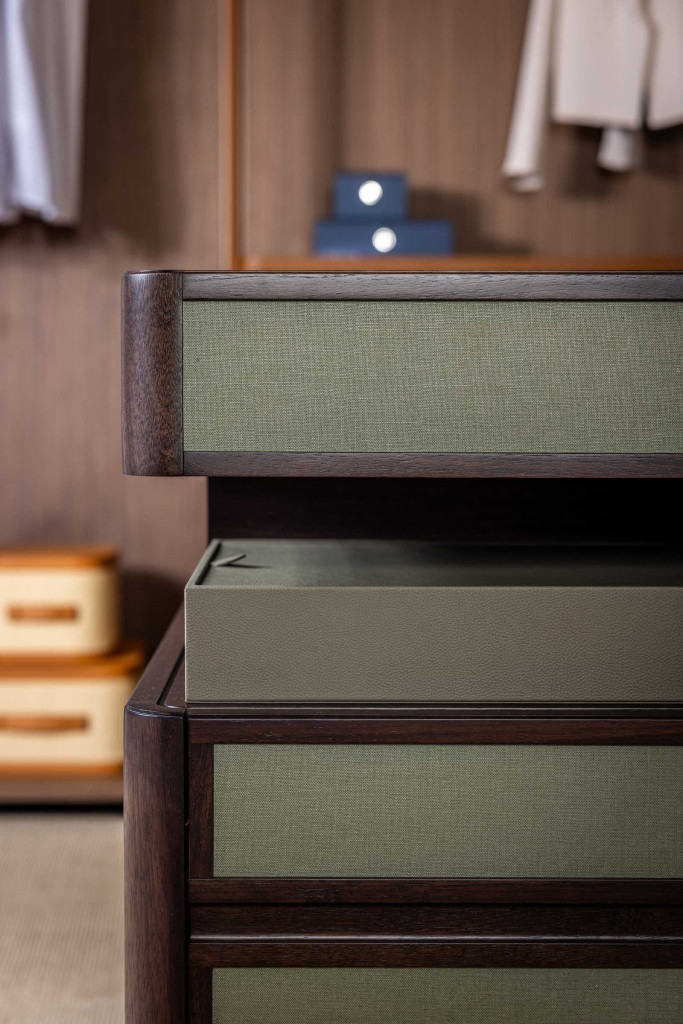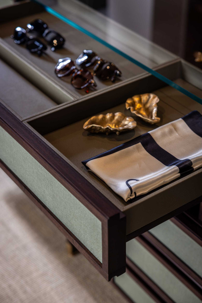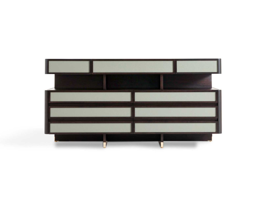 Full Island is a chest of drawers from the Full series designed by Roberto Lazzeroni. Conceived as a free-standing centrepiece, it features several drawers and pull-out trays, while the top is in extra-clear tempered glass. For the supporting structure, there is a choice of walnut, dark walnut, brown walnut and mocha walnut finishes, while the upholstery of the drawer fronts...