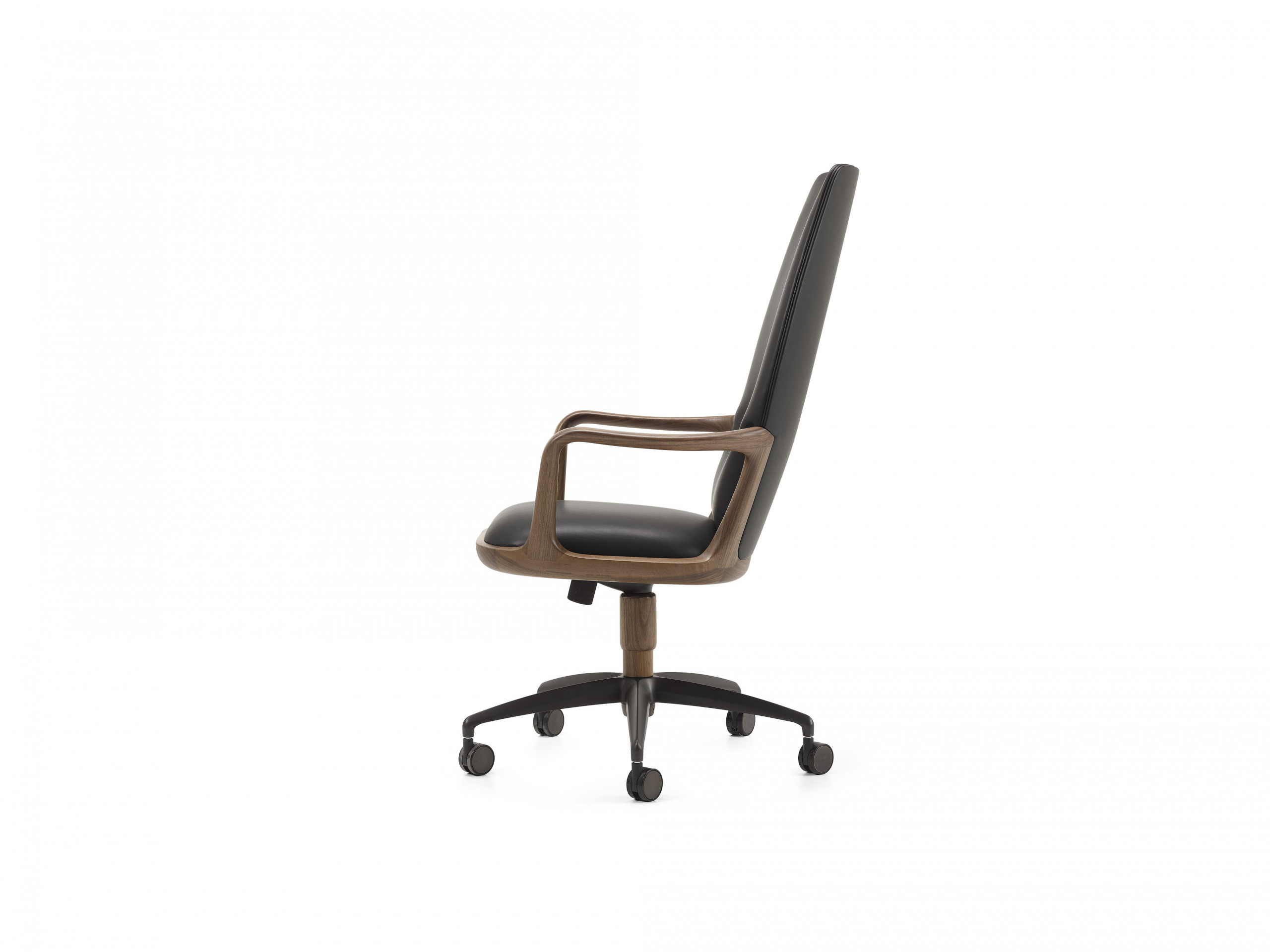 Designed by Giuseppe Casarosa in 2016. Vossia is an elegant directional chair made from FSC-certified solid American walnut wood. The curved poplar plywood backrest has polyurethane foam padding. The five-star swivel castor base is made from brushed aluminum with a bronze finish. A version with fixed brass feet is also available on request. The base features a fixed or gas-spring lift...
