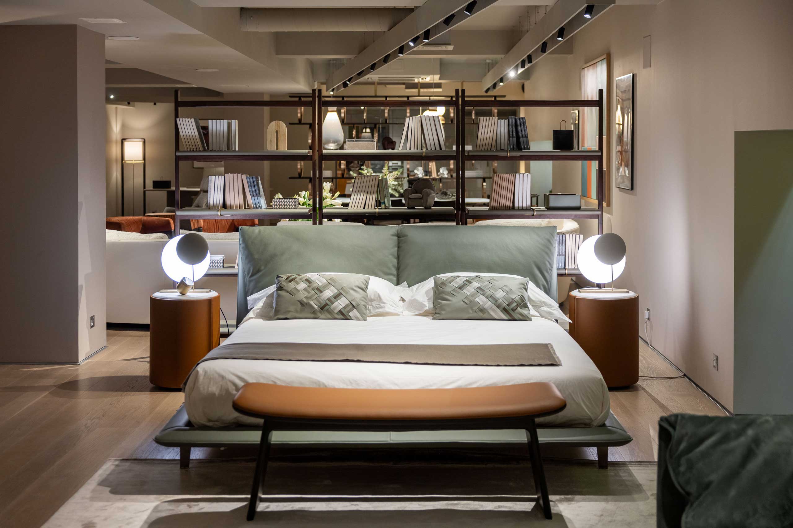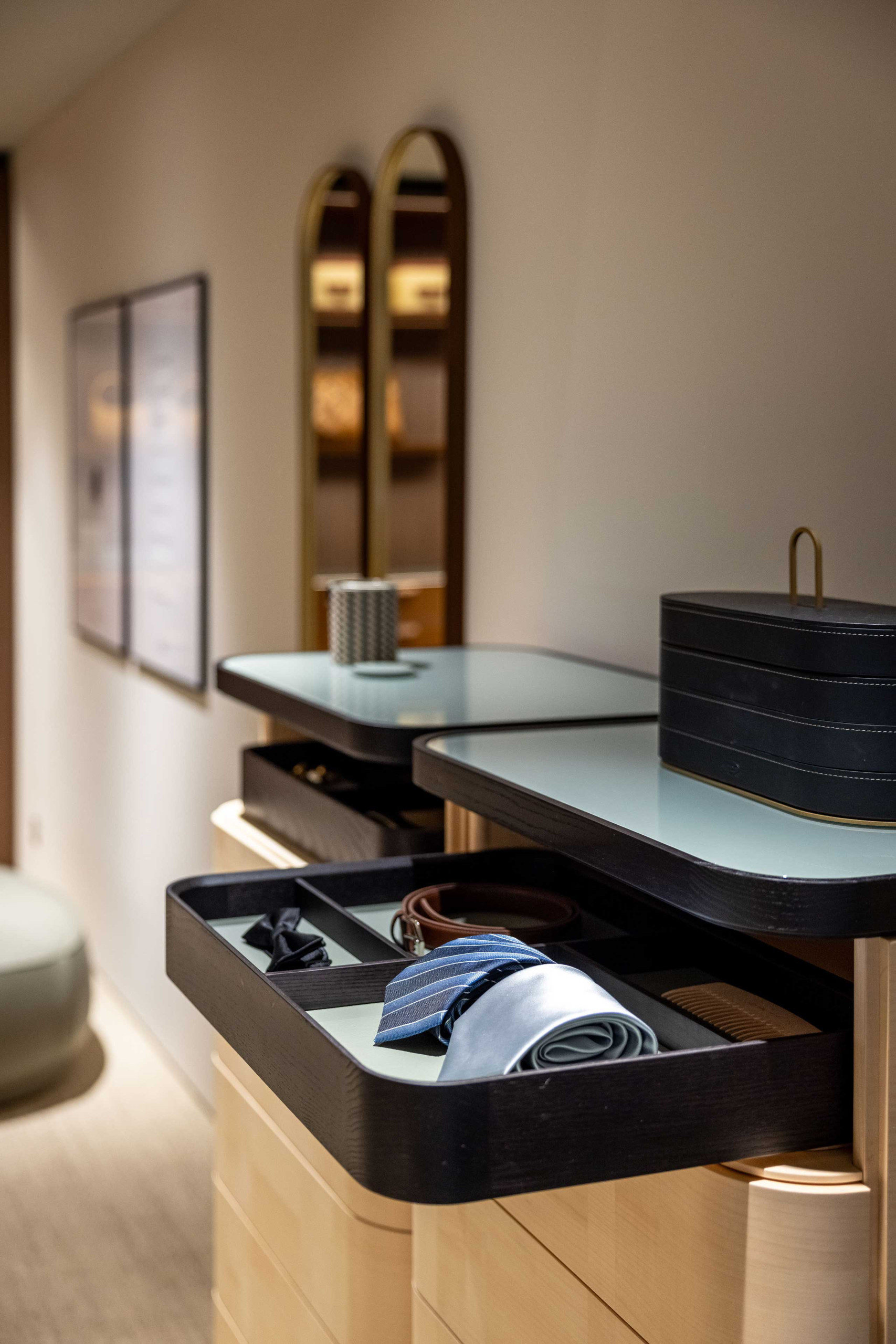 Un ampio spazio è stato dedicato all’area notte, nella quale si manifesta il perfetto connubio nato dalla collaborazione fra Ceccotti Collezioni e Poltrona Frau, con gli elementi di arredo della collezione DUO: dalla coppia di settimini DUO chest of drawers alla DUO bench, la panca dalla forma allungata ideale come fondo letto, senza dimenticare la Valet Stand, elemento di design sul quale poter appoggiare con cura un intero completo comprensivo di giacca e pantaloni.