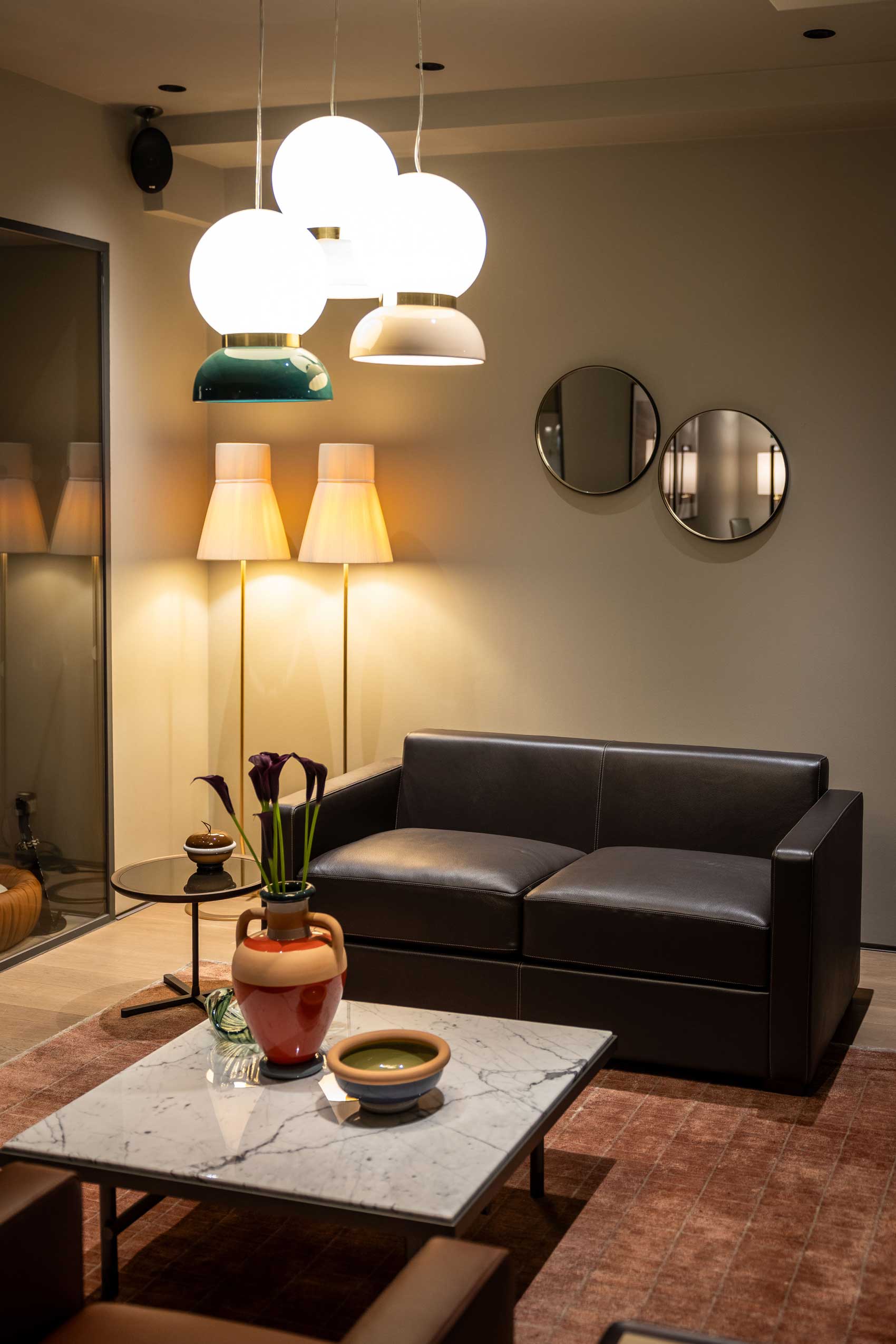 A completare l’accogliente atmosfera sono state selezionate alcune fra le soluzioni di illuminazione di design di Ceccotti Collezioni: la lampada a sospensione Saint Louis, ideale sopra ad un tavolo anche in una configurazione multipla e la lampada Audrey la cui forma del paralume ricorda quella del cappello dell’omonima attrice britannica.