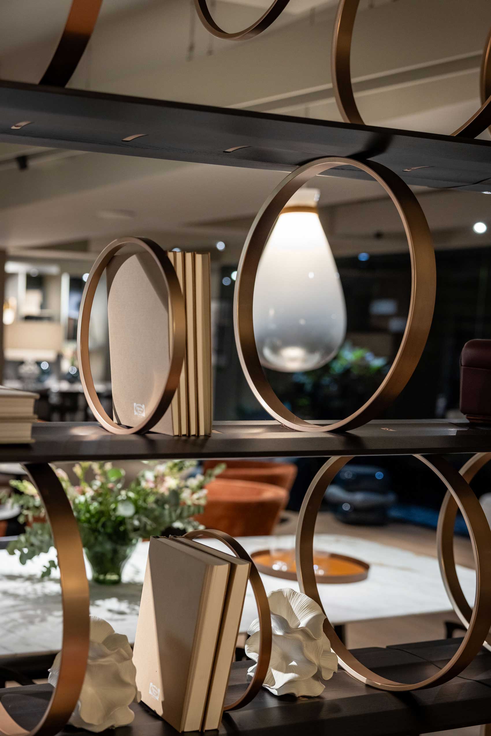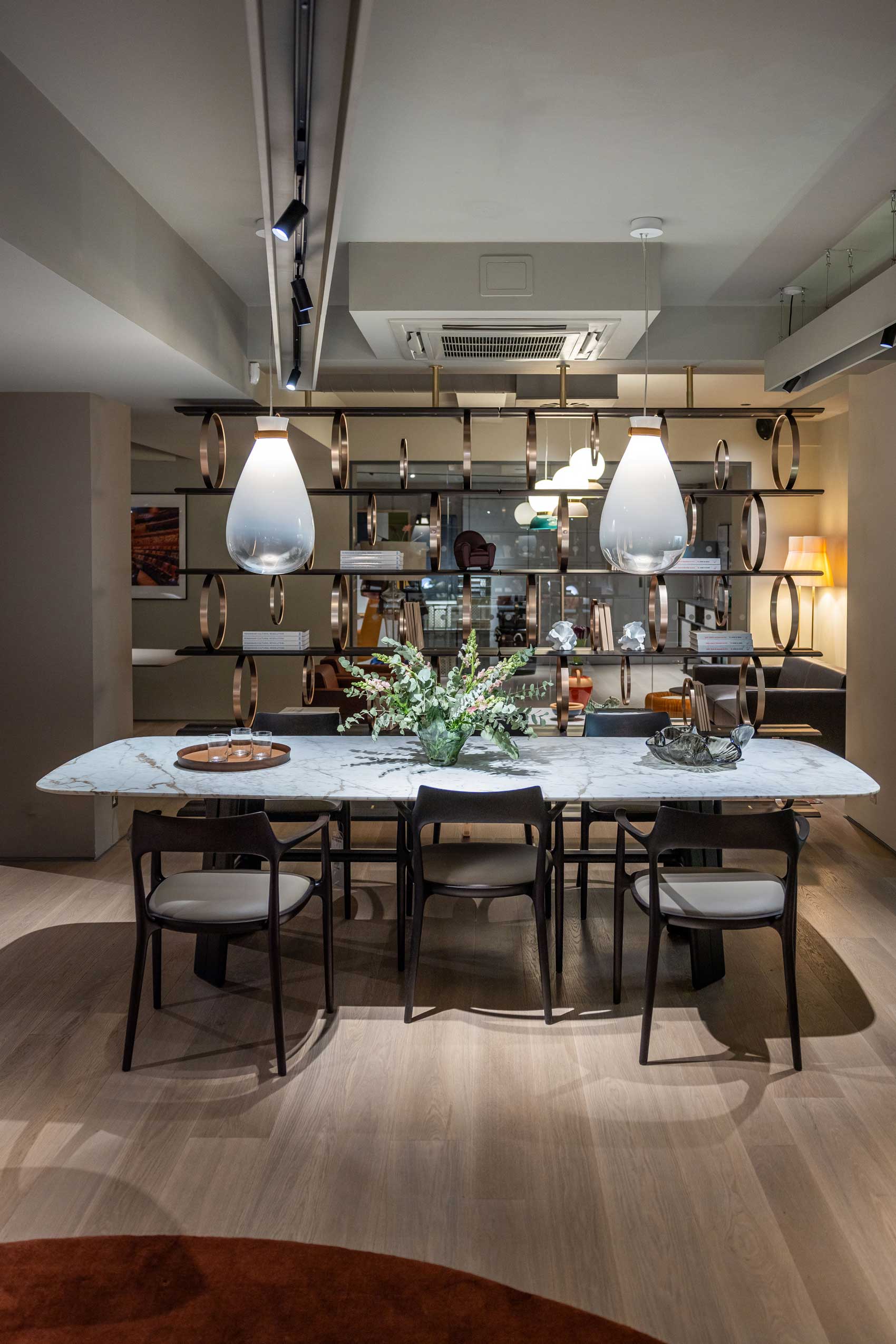 Rappresentativa anche la zona dining, che vede l’imponente tavolo DUO con piano in marmo Calacatta abbinato alle sedie Janine e alla libreria modulare Flying Circles, nata nel 2007 dalla mente progettuale di Massimo Castagna.