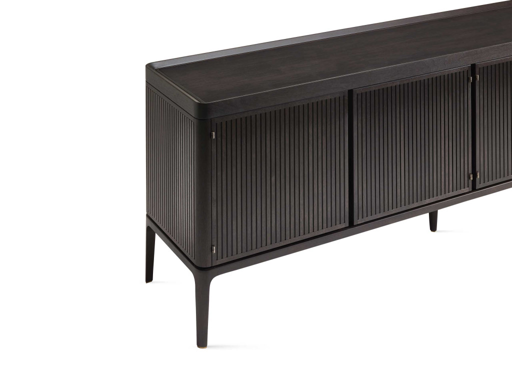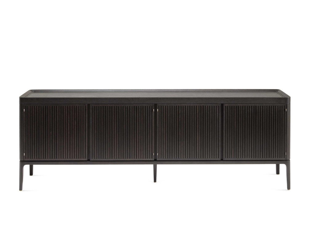 Elegante, geometrico, lineare. Full nasce nel 2017 dalla matita di Roberto Lazzeroni con una logica architettonica che somma alla semplicità del volume, la capacità contenitiva degli interni. Un sistema che si configura come credenze e contenitori di grande qualità, esprimendo la capacità di Ceccotti Collezioni di tradurre la contemporaneità e la possibilità di personalizzazione pressocché totale. Full si costruirsce intorno a una struttura e una base in massello di noce americano, mentre le ante, i fianchi e i frontali dei cassetti possono essere rivestiti in ebano, tessuto, pelle o laccati. In alternativa è disponibile la versione extra, in cui il rivestimento è costituito da sottili strisce in legno massello applicate manualmente una vicino all'altra. Il piano è incassato nella cornice in massello di noce americano e può essere in legno, in vetro colorato o in marmo. La possibilità di scegliere tra molte combinazioni di materiali e tonalità differenti conferisce un grande impatto visivo, e testimonia l'impegno dell'azienda nella ricerca di sofisticate finiture da sperimentare. Tale ricerca è espressa anche nei dettagli, come le cerniere in ottone massiccio, o la possibilità di rivestire il pannello interno posteriore in tessuto e i fondi dei cassetti in pelle.